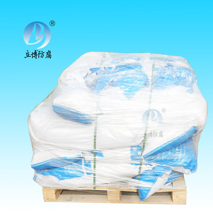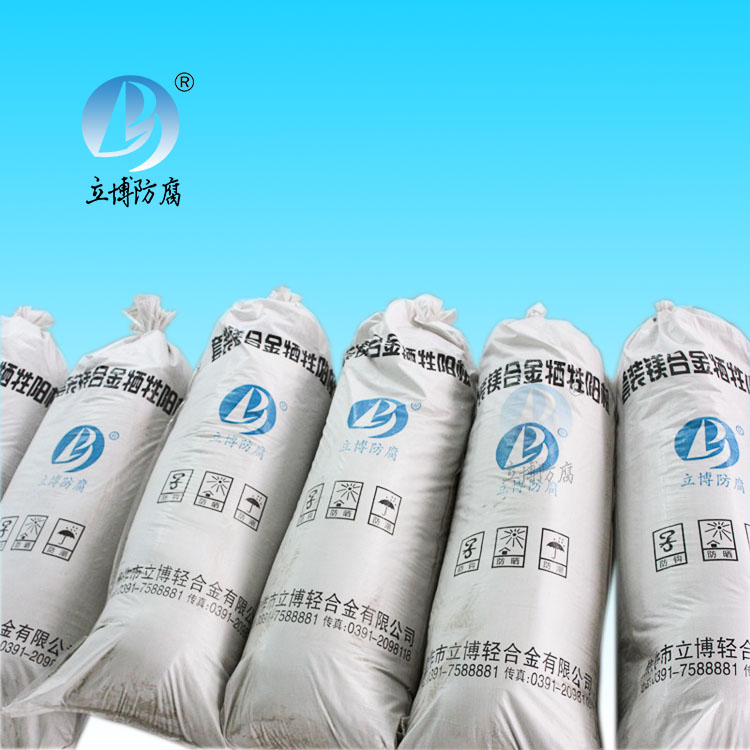 成套鎂犧牲陽極,由鎂犧牲陽極錠1支,一根VV-10㎜2電纜3米,填包料50kg,棉布口袋1條,塑料編織袋1條組成。即棉布口袋內(nèi)有鎂犧牲陽極錠1支其鐵芯上焊VV-10㎜2電纜3米1根,焊接處做絕緣處理,并套有熱縮管。鎂犧牲陽極錠周圍均勻分布50kg填包料。棉布口袋外套塑料編織袋1條。